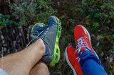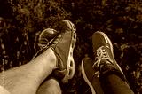 Two pairs of legs wearing vibrant red and gray-green sneakers dangle over a dark, mossy forest floor, symbolizing outdoor adventure and leisure.