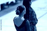 A woman with her back turned is wearing a red dance dress accented with black lace.