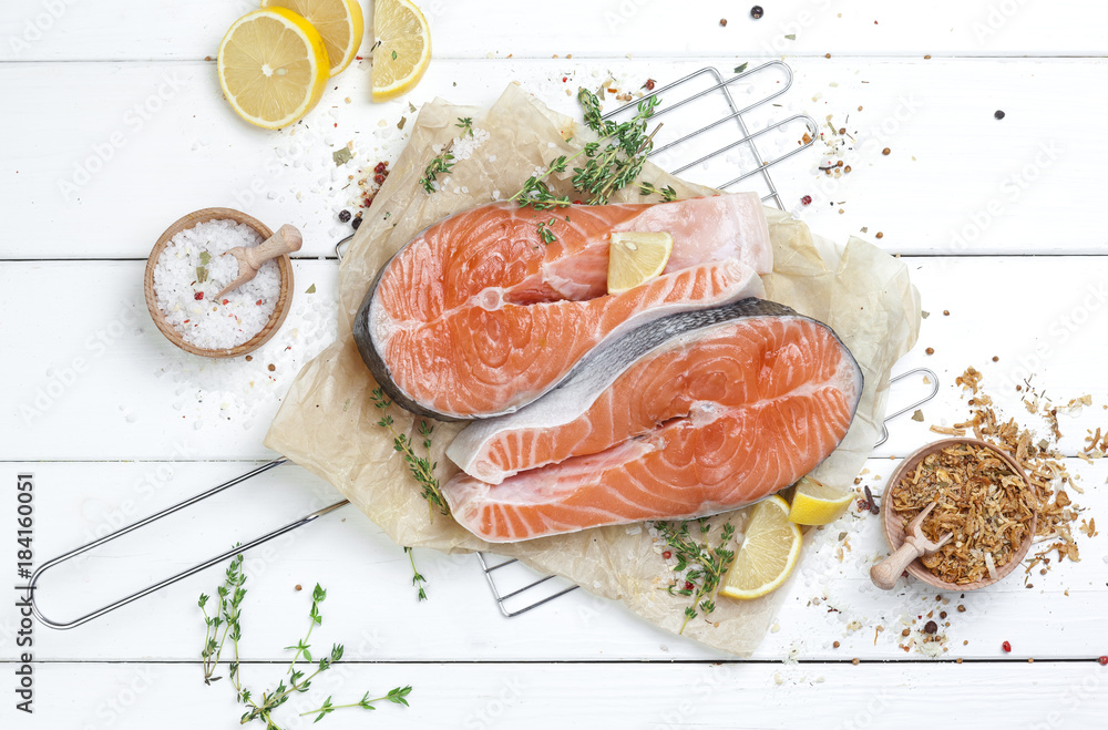 Raw salmon steak on white wooden background top view