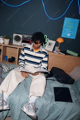 Teenage Black boy sitting on bed reading notebook, surrounded by backpack, laptop and personal items in modern bedroom, focused on studying or reviewing schoolwork