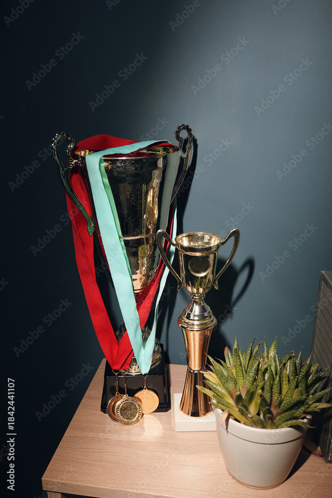 Two gold trophies with colorful ribbons and medals standing on wooden surface next to green succulent plant, sports achievement awards displayed against plain blue wall
