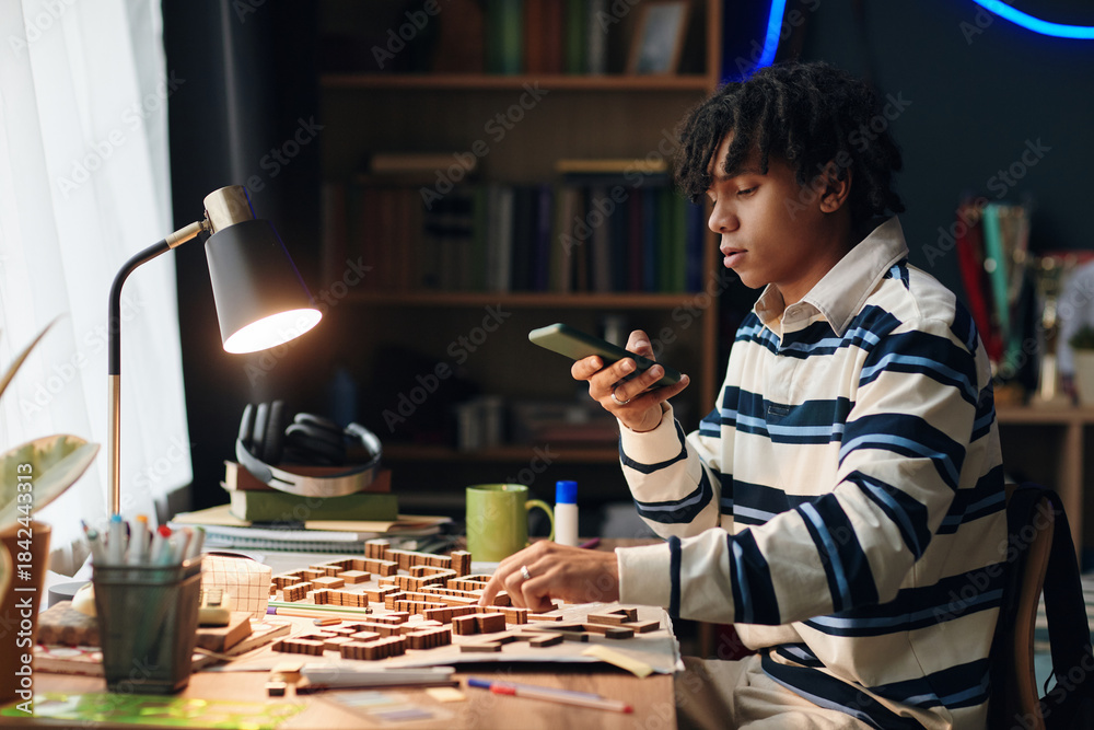 Teenage Black boy sitting at desk using smartphone while assembling wooden puzzle or architecture miniature, focused on multitasking with concentration, bookshelf and study materials in background