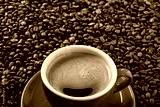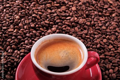 Red coffee cup and saucer one single for espresso or capuccino on a background of scattered dark coffee beans photo