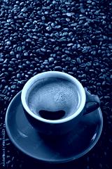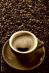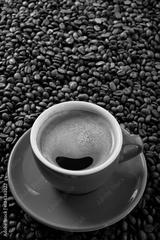 Red coffee cup and saucer one single for espresso or capuccino on a background of scattered dark coffee beans photo vertical
