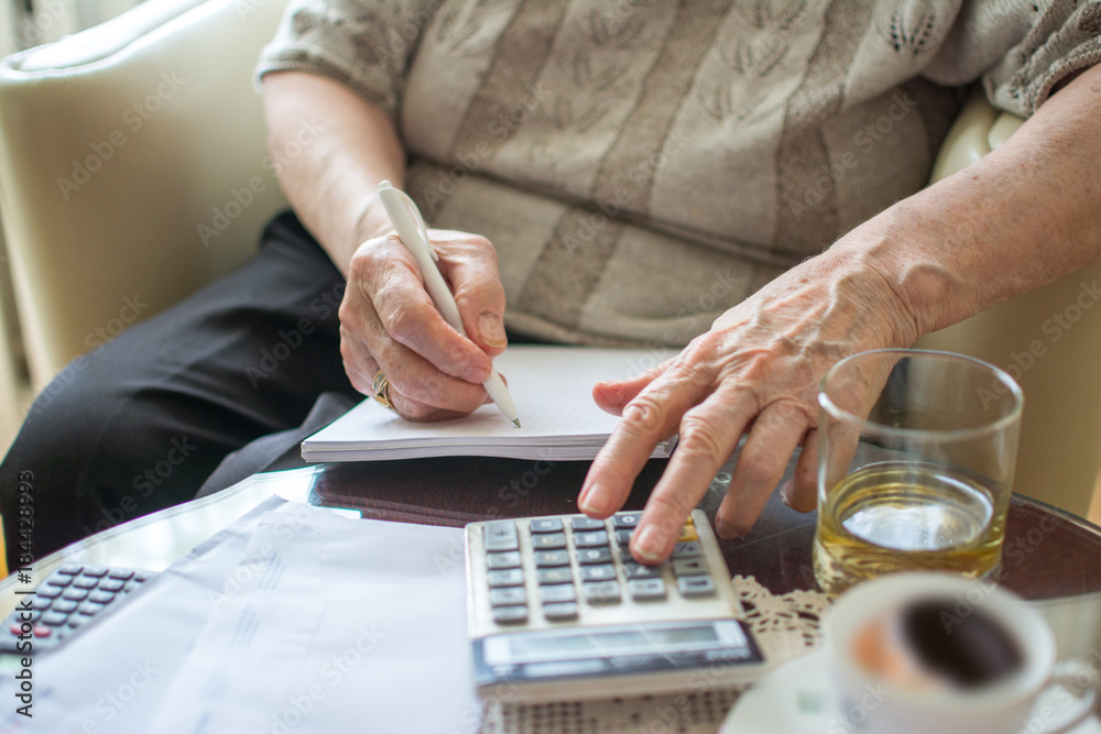 Close up of wrinkled senior's hands with pen, notebook and calculator.
