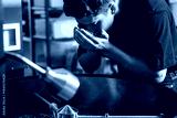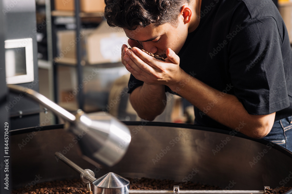Barista holding in his hands fresh roasted coffee beans and smelling them to check the level of readiness