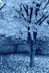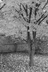 A maple tree in orange fall color splendor in a backyard with a fence.