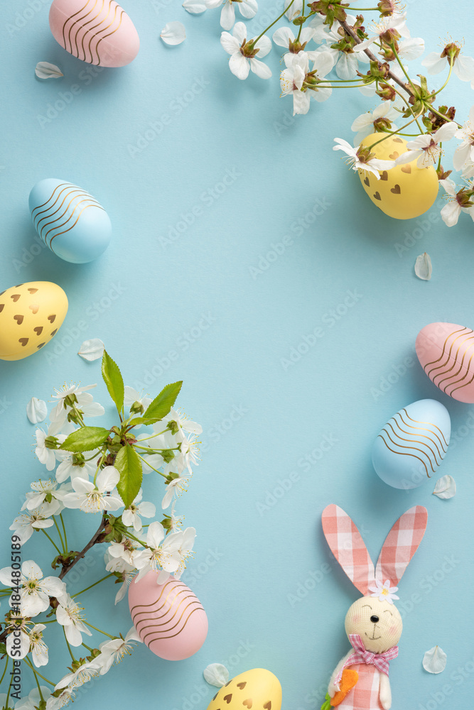 Vibrant vertical Easter scene with pastel eggs, white blossoms, and a friendly bunny. Perfect for Easter greetings, spring celebration, and seasonal stock images with soft blue background