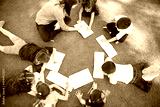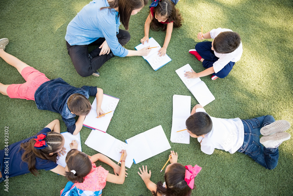 Top view of preschool students learning and taking a class outdoors