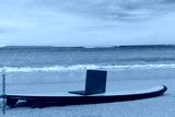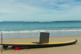 A laptop rests on a surfboard at the beach with ocean waves nearby
