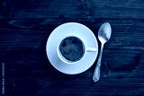 A cup of espresso coffee on a dark wooden background. Top view. Free space for text.