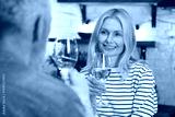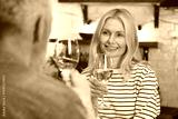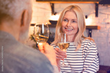 Happy relaxed aged couple during romantic dinner drinking white wine. St. Valentines Day concept. Bonding and togetherness. Love and care