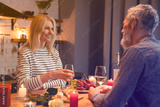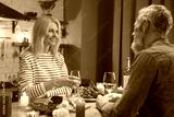 Adorable middle-aged couple looking each other into their eyes during romantic dinner in the kitchen on St. Valentines Day. Dating and relationship, celebrating anniversary