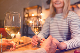 Cropped shot of a romantic date with happy couple drinking wine holding their hands in the kitchen. Proposal for Valentine`s Day, anniversary. Love and relationship concept