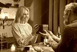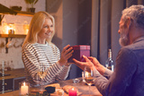Happy mature couple sharing presents for anniversary or St. Valentines day during romantic dinner in the kitchen. Love language - gift receiving. Special celebration