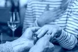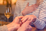 Impressed by the proposal woman in the background with her hand and engagement ring on a date. Wedding, diamond ring, new beginnings, future family