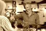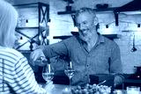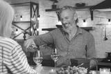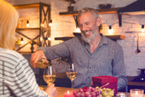 Cheerful middle-aged man pouring wine into glasses during romantic date in the kitchen. Quality time together - love language. Celebration of special event