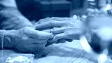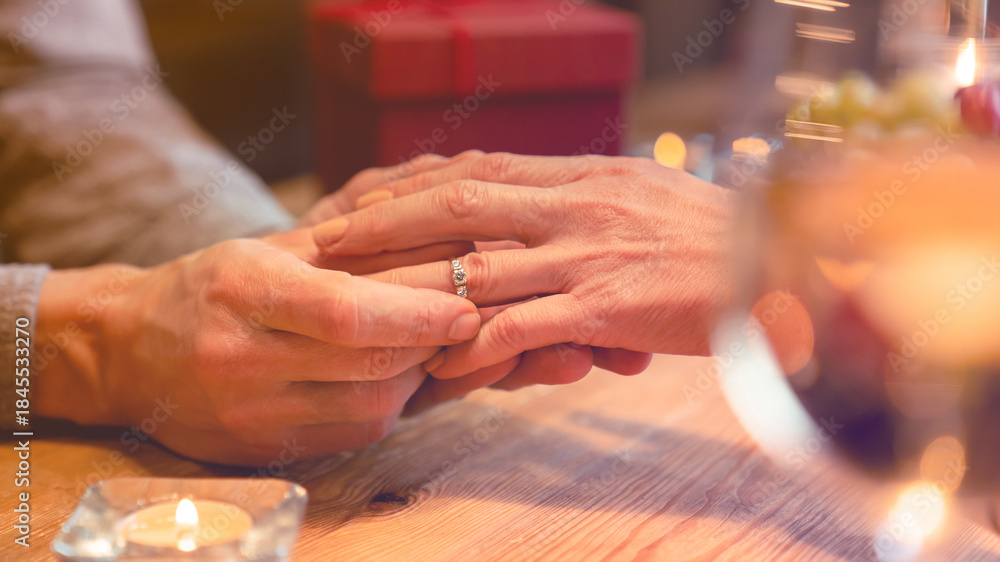 Close up photo of couple`s hands with engagement ring during romantic date. Wedding, proposal of heart, she said yes concept. Gift receiving - love language. Present for Valentine`s day