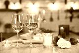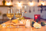 Shot of a romantic dinner table with glasses of wine, candles and rose in the kitchen. Valentin`s day, anniversary, engagement, proposal, romantic atmosphere. No people