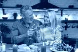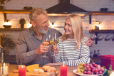 Happy married couple celebrating special event during the romantic dinner in the kitchen while clinking toasting cheering wine glasses. Love and relationship concept