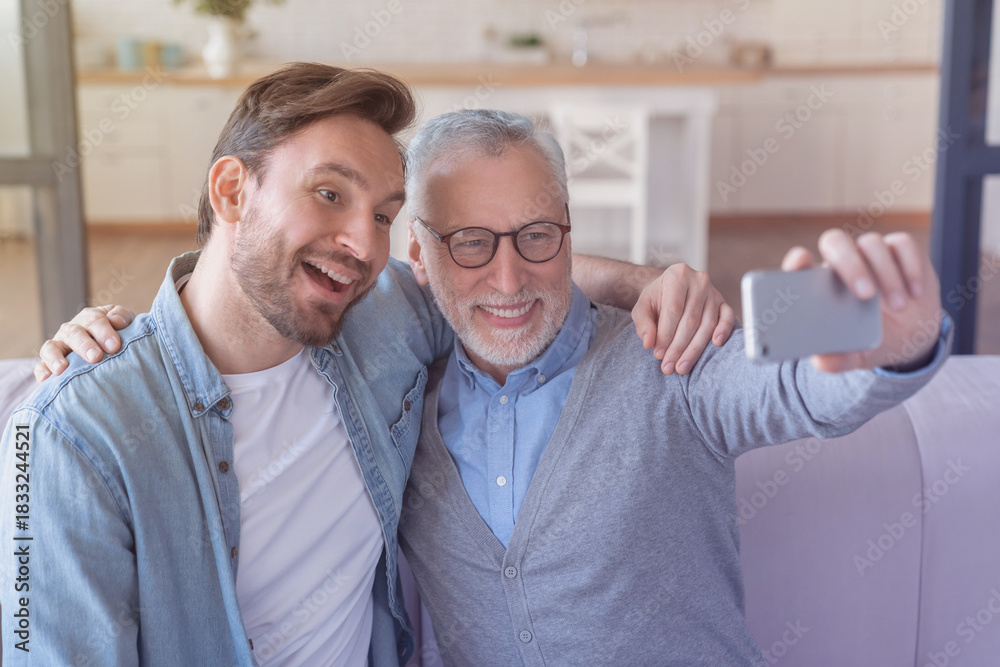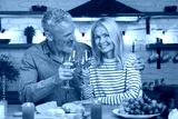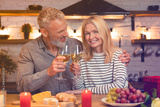 Cheerful mature caucasian couple having romantic date in the kitchen while dining and drinking wine alcoholic beverage, celebrating anniversary, quality time together