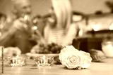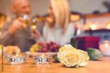 Focused shot of a romantic dinner with candles and a rose and happy couple in the background. Valentine`s day, proposal, engagement, anniversary celebration. She said yes