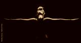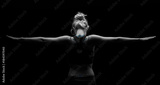 Beautiful fit and healthy blond woman in black top in dark with arms stretched from behind artistic conversion