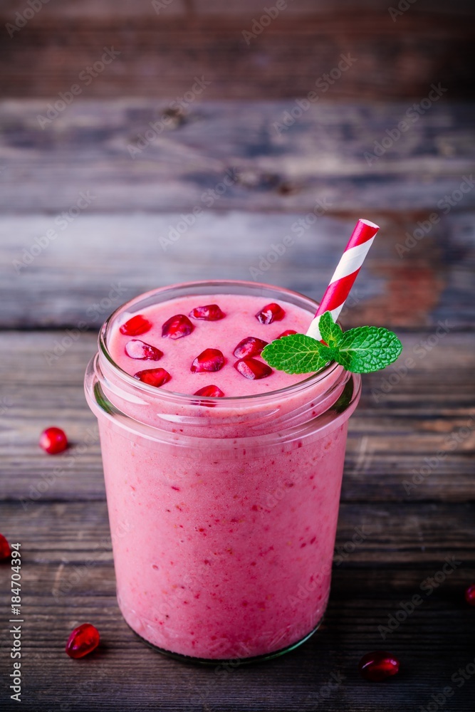 Pink pomegranate smoothie in a glass jar with mint and fresh seeds