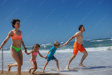 Young parents and kids happily running on the sandy sea shore