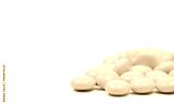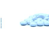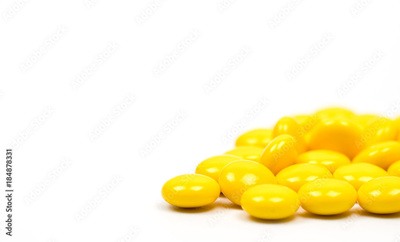 Yellow sugar coated tablets pills on white background with copy space. Medicine for treatment constipation.