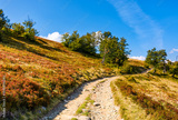 dirt gravel road winding uphill. hiking trail in carpathian mountain landscape under blue sky. traverse path through steep slope. remote place for outdoor adventures. concept for wellness and escape