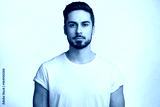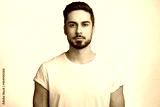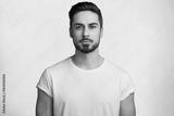 Unshaven confident serious young male enterpreneur with attractive appearance dressed casually as spends weekends at home, isolated over white concrete background. Stylish handsome guy indoor