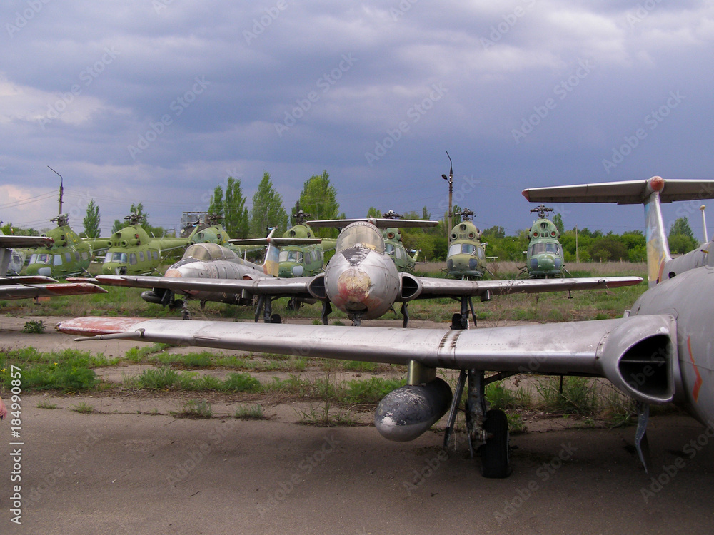 Old planes. Cemetery of aircraft engineering. Parking of old aircraft. Old helicopters. The gray plane. Green helicopter. Old flying technology.