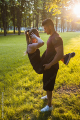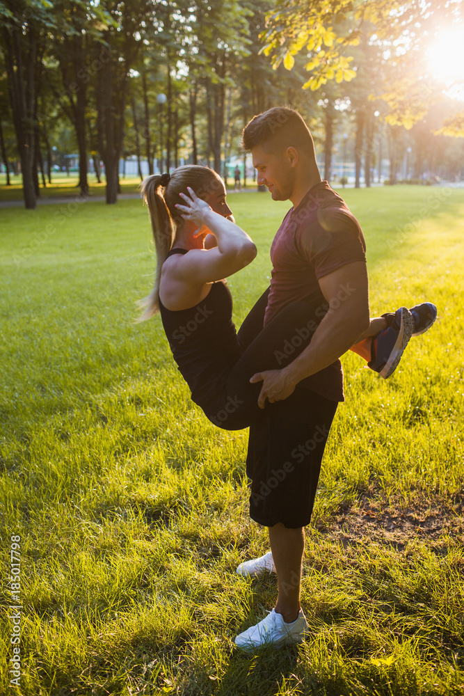 love sportsman couple support workout outdoor concept. exercises for the abs. romance of active people.