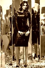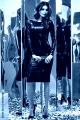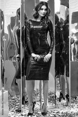 Sexy fashion beautiful brunette hair woman wear skinny shiny sequins red dress for party accessory bag jewelry high heel shoes glamour model pose style New Year Christmas Saint Valentine's Day mirror.