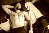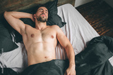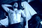 Portrait of fit male model asleep in luxurious bedroom bathed in bright warm morning window light