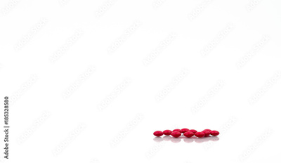 Red tablets pills isolated on white background with copy space for text. Global healthcare concept. Vitamins and supplements.