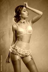 Lady in white vintage retro lingerie posing at camera