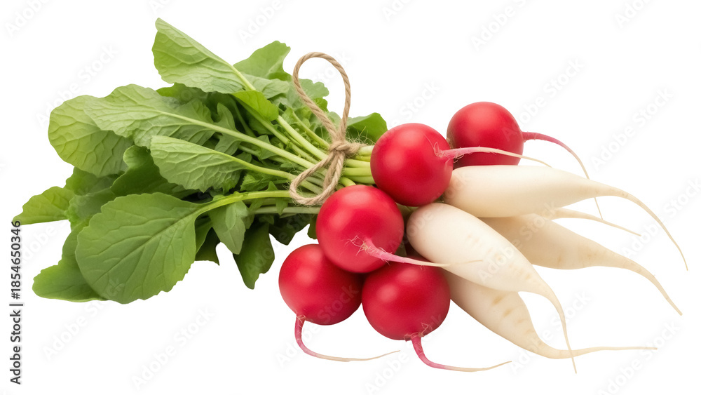 Bunch of radishes PNG isolated on transparent background, fresh red and white root vegetables with green leaves for healthy eating