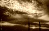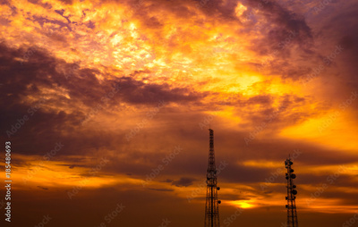 Two telecommunication towers on dramatic dark-orange sky and cumulus clouds background