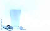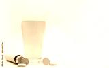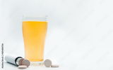 Effervescent tablets tube with blank label and orange effervescent bubbles of calcium and vitamin C in transparent glass. Vitamins, minerals and supplement concept.