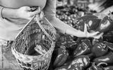 Young woman buying at street market, close up photo. Lifestyle, consumerism, shopping