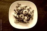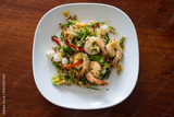 Fried vermicelli noodles with acacia, egg and shrimp in white plate at restuarant, flavorful experience.
