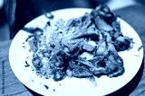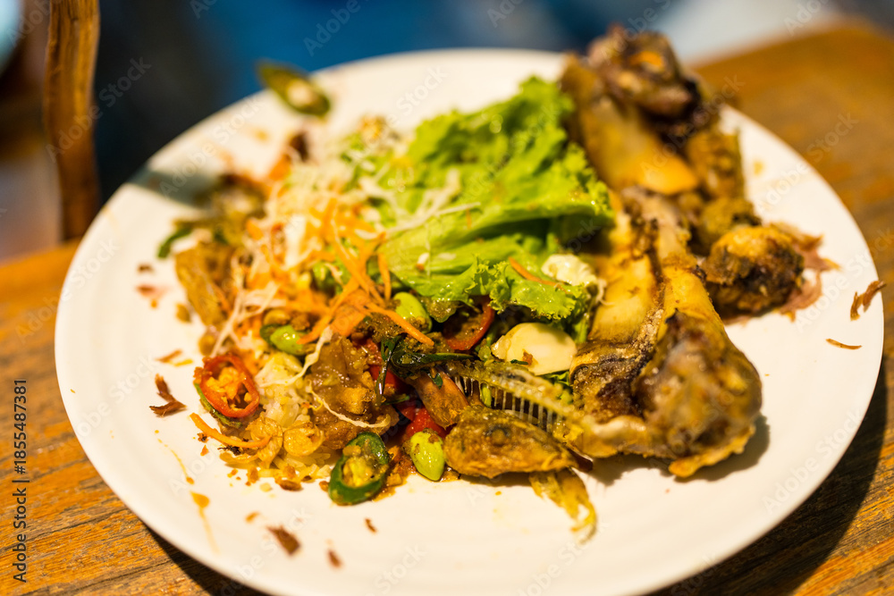 The food waste. Remains of fried fish. Fishbone and leftover meat after eat with vegetable scraps in a white plate on a wooden table.