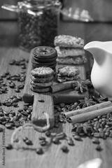 Aroma coffee candy chocolate cookies and spices on the wooden table. Christmas sweets. Dark wooden background. Top view. Close. Closeup.