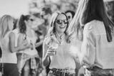 Group of people standing, drinking an having a good time at outdoor party