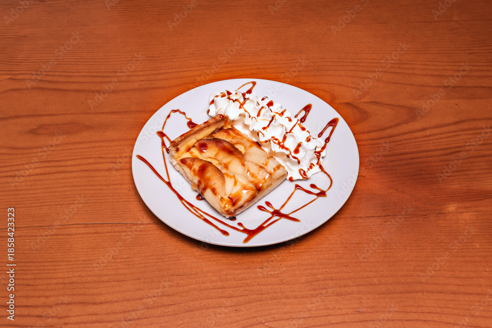 Puff pastry roll with apple and dried cranberries, sprinkled with brown sugar before baking to create a caramelized crust, served with vanilla sauce