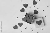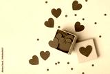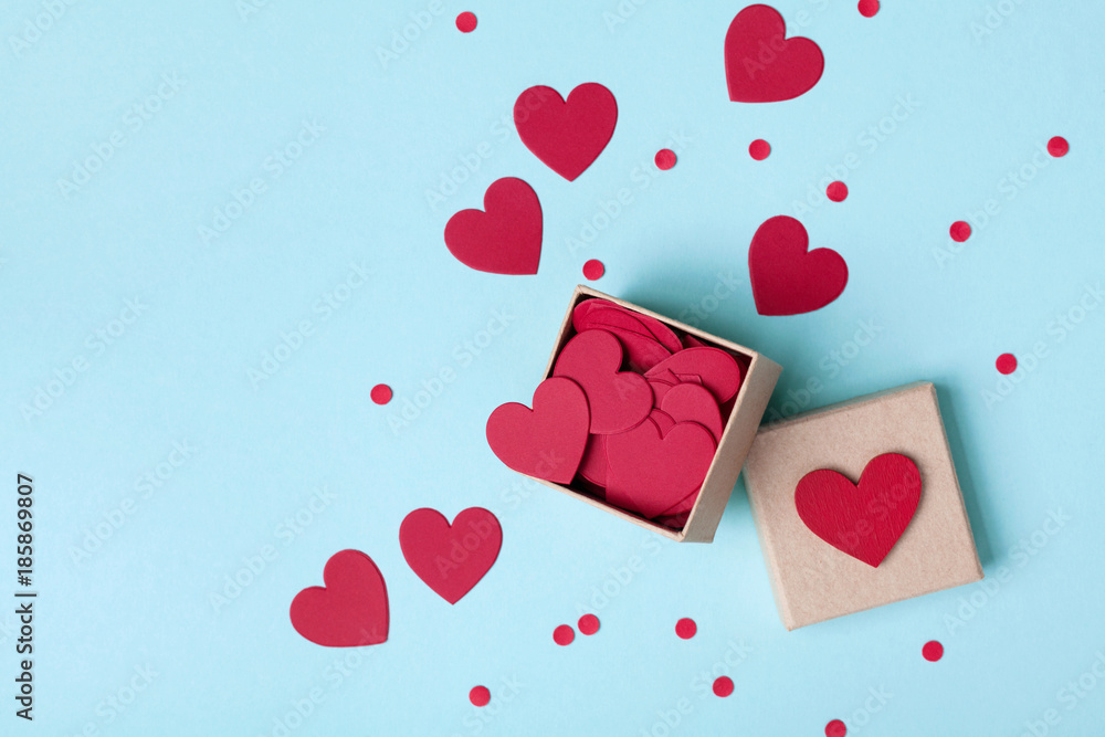 Box full of red hearts and confetti on blue table top view. Valentines day background. Flat lay style.