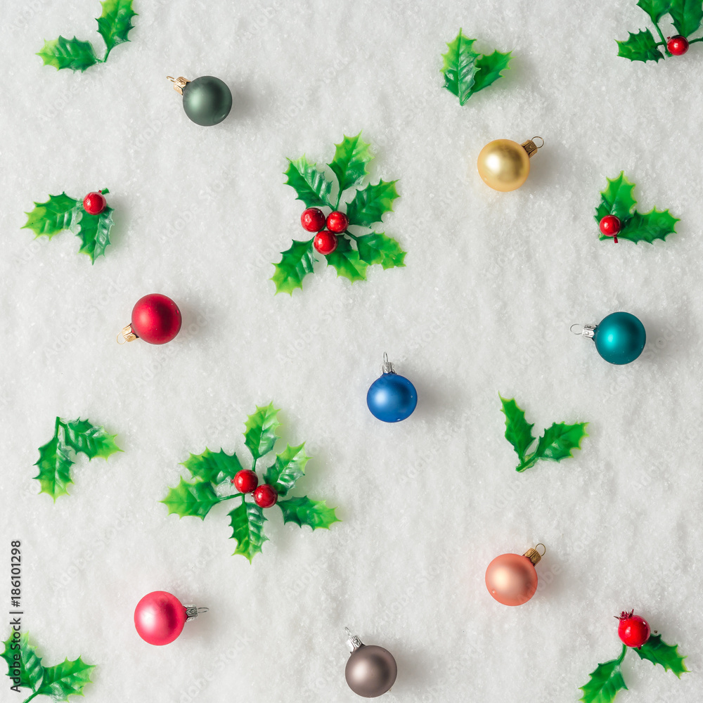 Creative layout made of colorful Christmas decorationin snow. New year background. Flat lay.