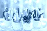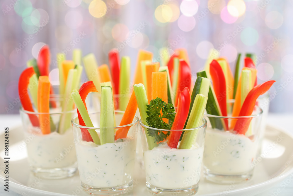 Verrines appetizer with carrot, cucumber, celery and red bell pepper sticks in glasses on platter at bokeh background, view from above, close-up
